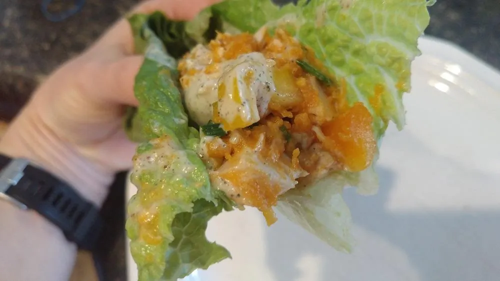 2 wraps is a serving so I experimented and did 2 different wraps. I did a romaine lettuce head for 1 and a Spinach Wrap for the other. I LOVE these wraps. They have a sweet flavor since they have apple in them and they are SO SO good with anything. I use them for breakfast a lot. Some eggs and avocado – Oh nom nom!!